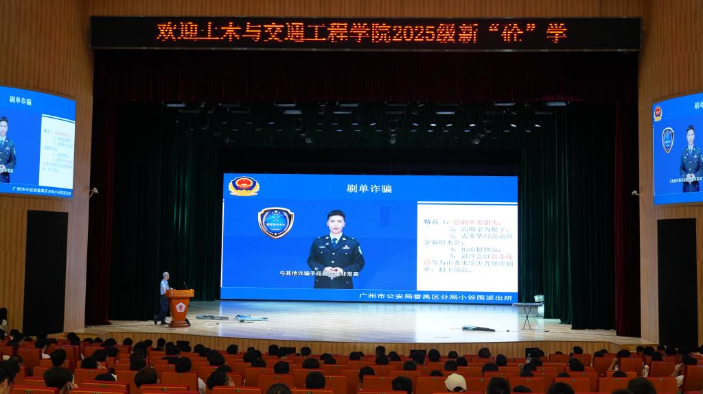 为增强学生防诈意识,切实保障人身与财产安全,9月9日下午,土木与交通工程学院在大学城校区文化活动中心演艺厅举办2025级新生安全防诈专题讲座。番禺区分局小谷围派出所民警陈林群应邀作主题分享。学院党委副书记陈颂坚、2025级辅导员及600余名新生参加。