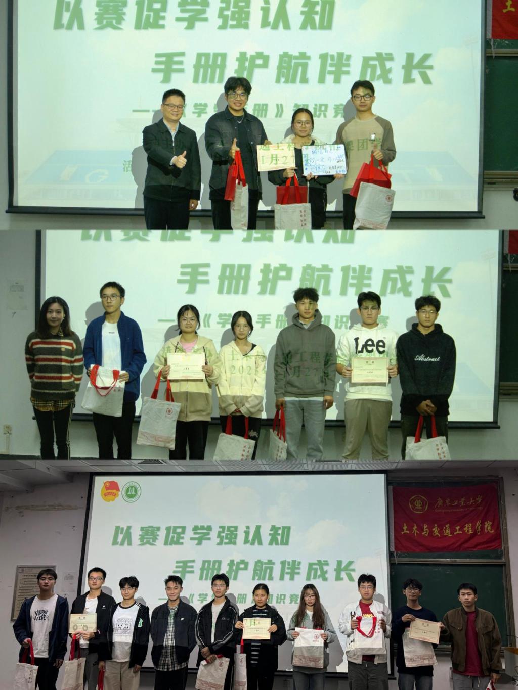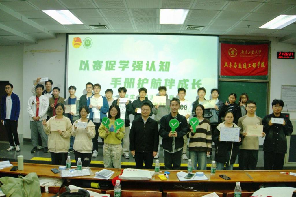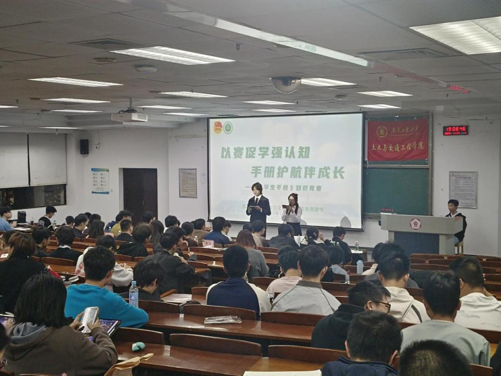 为进一步加强学生对学校规章制度的理解,筑牢遵章守纪意识,培育优良学风、舍风、院风,土木与交通工程学院面向2025级全体新生班级,组织开展了第一届《学生手册》知识竞赛。11月27日晚,竞赛现场复赛正式拉开帷幕。学院党委副书记陈颂坚、辅导员刘甜甜、唐熙、王梓茜及实习辅导员龙瑜出席活动并担任评委。